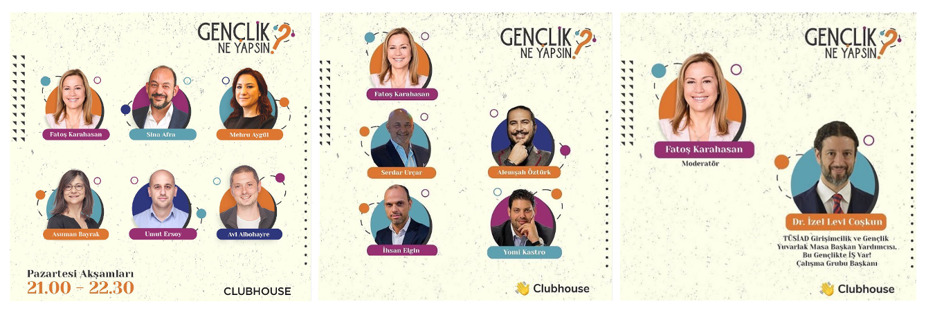 Detaylı Bilgi2021 yılında, pandemi koşulları ile birlikte özellikle gençler tarafından oldukça rağbet gören Clubhouse’da, Fatoş Karahasan’ın moderatörlüğünde gençlerle çalışan STK’ları konuk olarak ağırladığımız sohbetler serisi gerçekleştirdik.